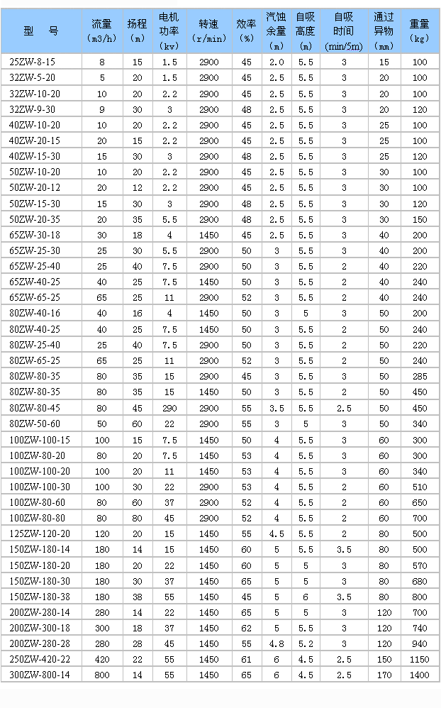 一、產(chǎn)品概述: ZW型自吸式無(wú)堵塞排污泵,是本司根據(jù)ZX型自吸離心泵及QW型潛水排污泵的結(jié)構(gòu)及性能,借鑒國(guó)外同類(lèi)產(chǎn)品之優(yōu)點(diǎn),研制而成的集自吸及排污于一身的 泵種。既可象一般清水自吸泵那樣不需安裝底閥,不需灌引水,又可抽吸含有大顆粒固體直徑為出口口徑的60%和纖維長(zhǎng)度為葉輪直徑1.5倍的污物、沉淀物、廢礦雜質(zhì)、糞便處理及一切工程污水物和膠質(zhì)液體,完全減輕人力的勞動(dòng)強(qiáng)度,而且安裝使用方便,極少維修,性能達(dá)到國(guó)際 水平,具有廣闊的應(yīng)用市場(chǎng)和發(fā)展前景 二、適用范圍: 適用于化工、石油、制藥、采礦、造紙、纖維、漿料、紡織、食品、電廠(chǎng)及市政排污工程、公共設(shè)施排污、河塘養(yǎng)殖等行業(yè)。 三、產(chǎn)品優(yōu)點(diǎn): 1、排污能力強(qiáng):特殊的葉輪防堵設(shè)計(jì),確保了泵高效且無(wú)堵塞。 2、 :采用優(yōu)秀水力模型,效率比一般自吸泵高3~5%。 3、自吸性能好:自吸高度比一般自吸泵高 四、技術(shù)參數(shù): 流量:5 揚(yáng)程:12 電機(jī)功率:2.2-55KW; 轉(zhuǎn)速:1450-2900r/min; 口徑:φ25-φ300; 介質(zhì)溫度:≤ 自吸高度:4.5 五、型號(hào)意義: 六、ZW型自吸式無(wú)堵塞排污泵性能參數(shù): |