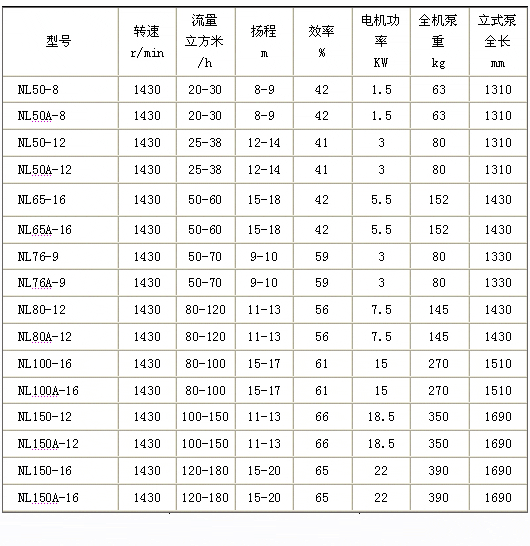 一、產(chǎn)品概述: NL型污水泥漿泵 本泵系單級單吸立式離心泵,主要部件有蝸殼、葉輪、泵座、泵殼、支撐筒、電機(jī)座、電動(dòng)機(jī)等組成。蝸殼、泵座、電機(jī)座、葉輪螺母是生鐵鑄造、耐腐性、耐腐蝕性較好,加工工藝方便。 葉輪為三片單園弦彎葉,選用半封閉葉輪,并采用可鍛鑄鐵、所以強(qiáng)度高,耐腐蝕;加工方便,通過性好,效率高。 為了減輕重量和減少車削量、泵軸是 碳素鋼冷拉園鋼制造。 泵座中裝有四只骨架油封和軸套,防止軸磨損,延長軸的使用壽命。 本泵可垂直或傾斜使用,占地面積小,蝸殼需埋在工作介質(zhì)中工作,容易啟動(dòng),不需弓I水,旋轉(zhuǎn)方向應(yīng)從電機(jī)尾部看是順時(shí)針方向工作。 總機(jī)長度備有各種規(guī)格,以便使用單位根據(jù)用途因地制宜地選用。 二、主要用途: 1、NL型多用液下泵系單級單吸離心泵,使用于礦山,造紙、印染、環(huán)保、石墨、云母、黃金、陶瓷、煉油、石油、化工、農(nóng)場、鹽場、碘場、染化、釀酒、食品、化肥、焦化、選廠、建筑、大理石廠、金礦、泥漿、流沙、泥塘、污塘、污濁液送吸濃稠液、裝料及懸浮物質(zhì)的污水作業(yè),也可作礦排水及含有泥塊的流體。 2、若與高壓水泵,水槍配合,組成水力機(jī)械化土方工程機(jī)組,就可用作于土地平整,河道與池塘的疏浚、鑿開等小型水利工程的挖方與輸方,以及城市的防空工程,地下工程。 三、型號意義: 四、NL型污水泥漿泵性能參數(shù): |