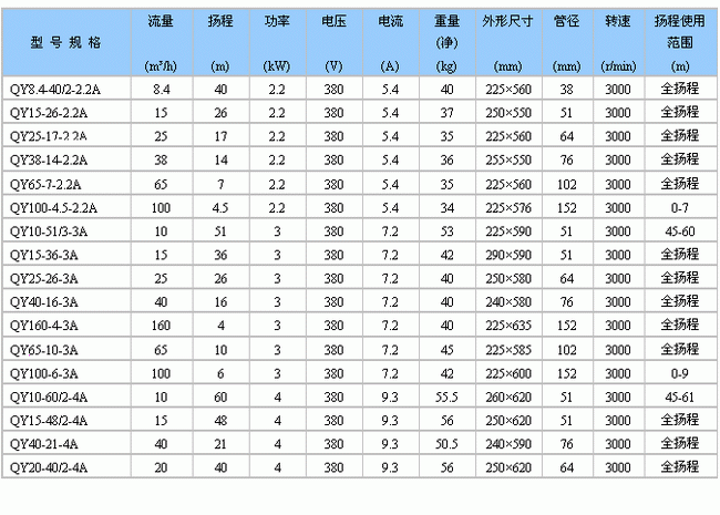 一、產(chǎn)品概述 QY型充油式潛水電泵(簡(jiǎn)稱(chēng)潛水泵)是水泵和三相異步電動(dòng)機(jī)合成一體的電力排灌設(shè)備。具有可靠的防水密封性能,體積小、重量輕、不需泵房,不需灌引水,使用維護(hù)和管理均為方便。 二、工作條件 ·潛水泵潛入水下深度不超過(guò) ·水溫不超過(guò) ·水中含砂量或含不溶于水的固體顆粒的體積比不超過(guò)0.1%,粒度不大于 ·無(wú)腐蝕、水的PH值為6.5—8; 如一般常溫清水:井水、河水、湖水。 三、應(yīng)用范圍 1、農(nóng)田園林的排灌、井灌、噴灌; 2、井下提水,水塔送水; 3、排澇防汛; 4、船舶倉(cāng)底排水; 5、城建、工礦給排水。 五、QY型充油式潛水電泵性能參數(shù)表