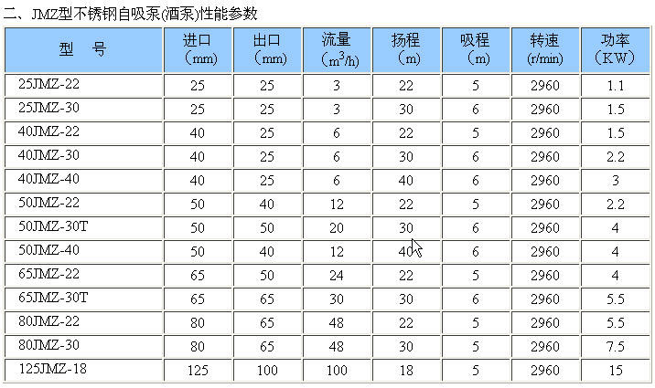 二、JMZ型不銹鋼自吸泵(酒泵)性能參數