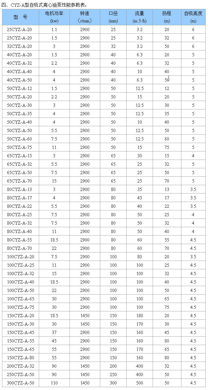 CYZ-A型自吸式離心油泵![]() CYZ-A型自吸式離心油泵 更多信息一、產(chǎn)品概述: CYZ-A型自吸式離心油泵是根據(jù)國(guó)內(nèi)外有關(guān)技術(shù)資料經(jīng)消化、吸收、改進(jìn)后研制而成的最新泵類產(chǎn)品,該泵適用于石油行業(yè)、陸地油庫(kù)、油罐車的理想產(chǎn)品,并適合于作船用貨油泵、艙底泵、消防泵和壓載泵及機(jī)器冷卻水循環(huán)等,分別輸送汽油、煤油、柴油、航煤等石油產(chǎn)品和海水、清水,介質(zhì)溫度 二、產(chǎn)品特點(diǎn): 1、該泵屬自吸式離心泵,它具有結(jié)構(gòu)簡(jiǎn)單、操作方便、運(yùn)行平穩(wěn)、維護(hù)容易、效率高、壽命長(zhǎng),具有較強(qiáng)的自吸能力等優(yōu)點(diǎn)。管路中不需底閥,工作前只需保證泵體內(nèi)儲(chǔ)有定量引油即可。用于油輪或輸水船舶上時(shí),可兼作掃艙泵,掃艙效果良好, 2、該泵是選用 材料精制而成,密封采用硬質(zhì)合金機(jī)械密封,經(jīng)久耐用,吐出管路不需要安裝安全閥,吸入管路不需安裝底閥,因此簡(jiǎn)化了管路系統(tǒng),又改善了勞動(dòng)條件。 三、型號(hào)意義:
