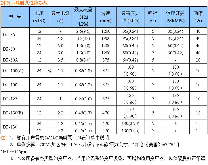 一、產品特點: 1.噪音低、耐腐蝕、壓力高,自吸高度 2.介質溫度可達 3.允許干運轉. 4.內裝壓力開關以保護泵運轉時不受損壞. 5.內裝溢流閥控制泵的正常運行. 6.拆裝方便. 7.采用安全低電壓,保證人身安全. 二、產品用途: 1.適用于家用自來水增壓、汽車沖洗、輪船上海水淡化. 2.適用于反滲透純水機、水處理設備、過濾機、噴霧裝置、化工計量加液及衛生、環保、印刷等行業中使用. 三、安裝指南: 1.安裝時,需拔出隔膜泵進出口的封蓋. 2.裝有隨泵附帶的進出口接頭,DP-130 DP-125 DP-100 DP-60型隔膜泵進出口采用ZG3/8″外牙G29/64″彎管接頭;DP-35隔膜泵進出口采用3/8″外牙軟管接頭. 3.泵應按水平安裝;如需垂直安裝時,泵頭應朝下. 4.在泵的進出管道中安裝一個過濾器,這是泵有效使用的保證.(DP-35型泵頭內已裝有過濾網,無需安裝過濾器). 5.泵的底座分尼龍底座,鐵底座橡膠腳柱.