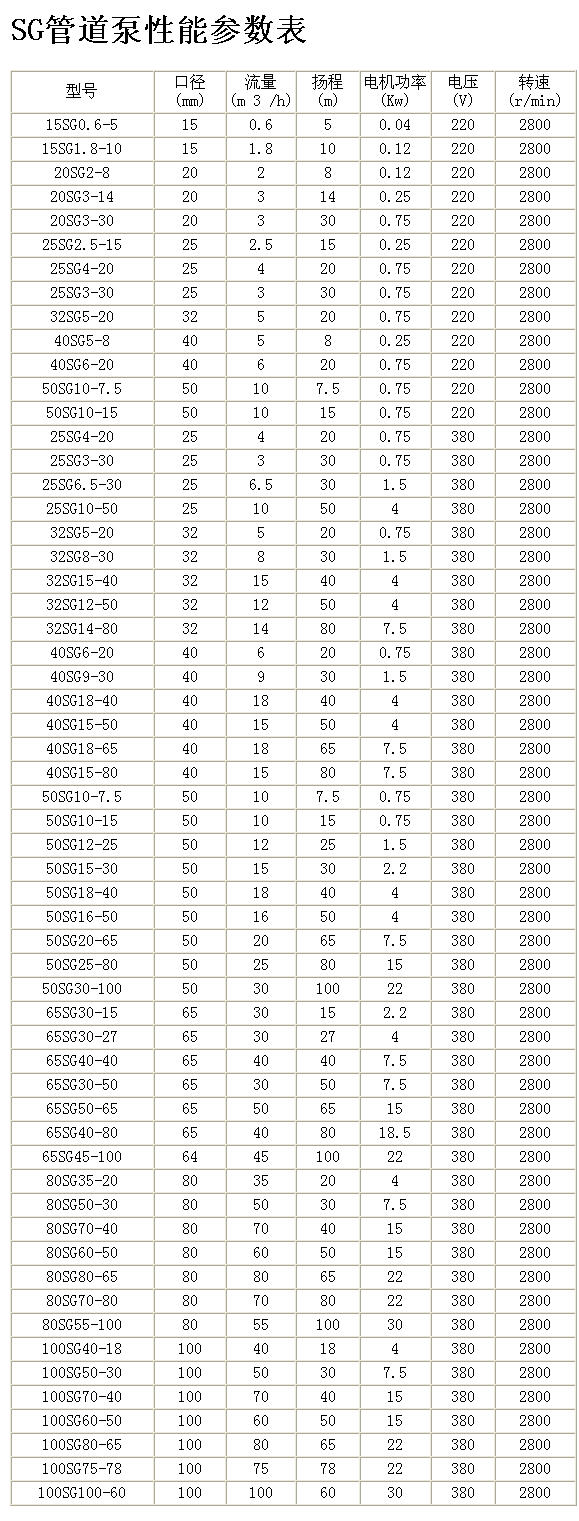1.SG系列普通管道泵適用于高層建筑增壓送水、園林噴灌、冷卻塔上水、遠(yuǎn)距離輸水、空調(diào)、制冷沖洗、浴室等冷;暖水循環(huán)加壓。使用溫度 2.SGR系列熱水管道泵適用于采暖、鍋爐等行業(yè)的高溫?zé)崴鰤貉h(huán)。使用溫度 3.SGP系列耐腐管道泵適用于輸送食品、制藥、造酒、化工等行業(yè)的工藝流程中腐蝕性介質(zhì),使用溫度 4.SGB系列防爆管道泵適用于輸送無腐蝕性液體,有甲烷或煤礦井下固定設(shè)備I類及工廠IIA、II B級,溫度組別為 T1、T2、T3、T4組存在爆炸性混合物的其它工業(yè)場所。使用溫度 5.SGPB系列耐腐防爆管道泵適用于輸送化工、制藥、石油、食品、國防等工業(yè)腐蝕性液體,有甲烷或煤礦井下固定設(shè)備I類及工廠IIA、IIB級,溫度組別為T1、T2、T3、T4組存在爆炸性混合物的其它工業(yè)場所。使用溫度 三、型號意義: