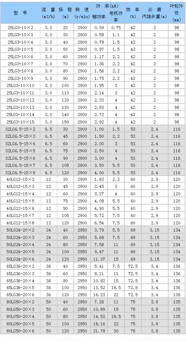 65 LG 36 - 20×6 65 – 泵進(jìn)出口直徑(mm) LG – 立式多級分段式離心泵 36 – 泵設(shè)計流量(m3/h) 20 – 泵設(shè)計點單級揚程(m) 6 – 級數(shù) ![]() |