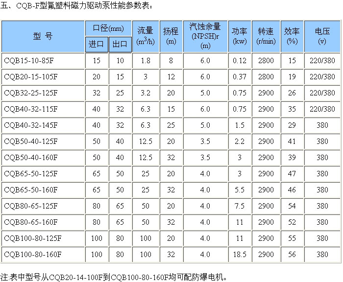 CQB-F型襯氟磁力泵一、產品特點: CQB-F型氟塑料磁力驅動泵防漏設計取消了軸封,利用磁力偶合間接驅動,完全消除了滴漏的煩惱,絕不污染使用場地。 由于泵的過流部分選用“氟塑料合金”制造。可連續輸送任意濃度的酸、堿、強氧化劑等腐蝕介質而毫不受損。 二、工作原理: 驅動裝置采用主動磁鐵聯軸器直接裝在電機軸上,泵室完全封閉,通過磁力偶合間接驅動泵軸上帶磁鐵的葉輪旋轉結構緊湊、安全節能。 堅固耐用的泵體結構雖然接觸液體部分是氟塑料,但泵外殼是金屬材料,故泵體足以承受管道的重量及抵受機械性沖擊。 三、主要用途: 本產品 適用于:石油化工、制酸制堿、有色金屬冶煉、汽車制造的酸洗工藝、稀土分離、農藥、染料、醫藥、造紙、電鍍、無線電等行業。 使用溫度: 四、型號意義: |