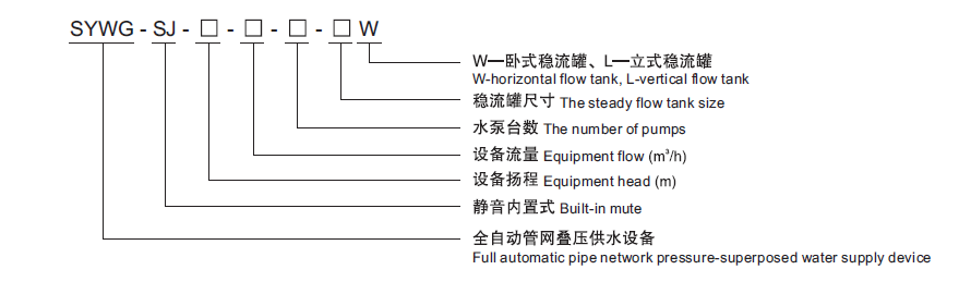 SYWG-SJ內置水泵管網疊壓供水設備是由不銹鋼潛水電泵、不銹鋼承壓穩流罐、不銹鋼閥門及不銹鋼管路、氣壓穩壓罐、智能變頻控制柜及底座等組成。能 應用于高樓供水、泵房改造及各種工礦疊壓供水和高檔飯店、賓館的供水設備。