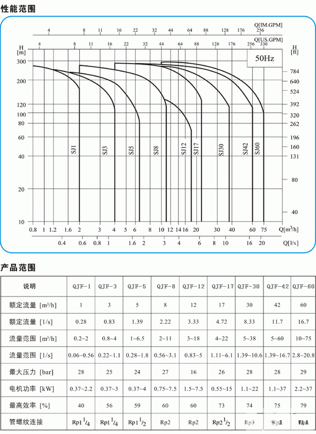 深井泵 QJ型不銹鋼深井泵曲線圖譜深井泵 曲線條件 ·曲線公差符合ISO9906,附錄A ·所有曲線都基于3×380V,50Hz,2850r/min測量值。 ·所有測量都是用溫度 ·曲線粗線部分表示推薦的性能范圍。 ·性能曲線包括諸如止回閥等可能產生的損失。