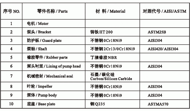 ZS型不銹鋼臥式單級離心泵材料對照表