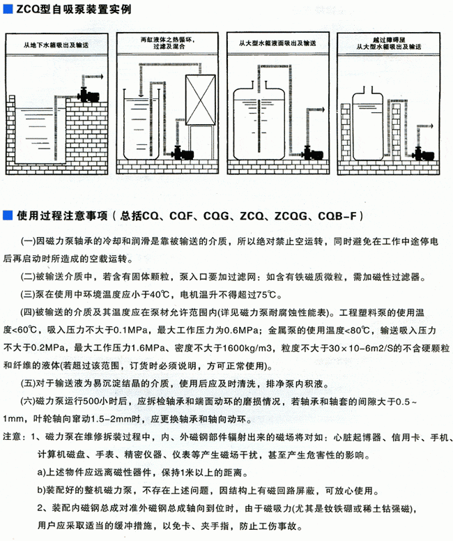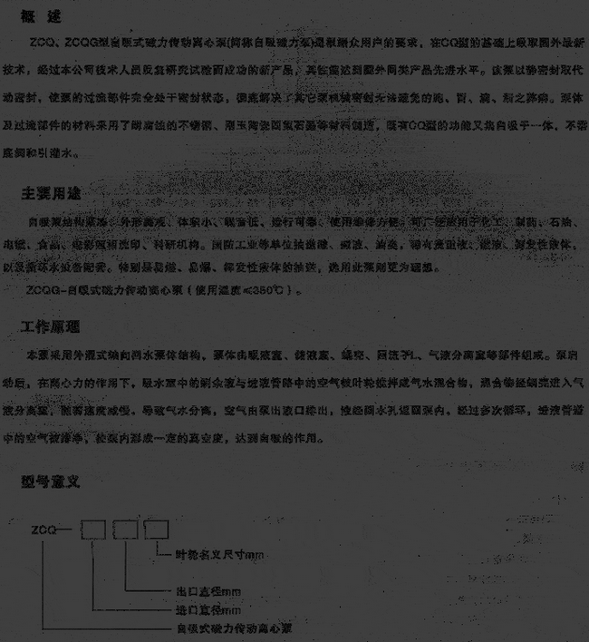 ZCQ型磁力傳動離心泵|詳細(xì)說明ZCQ型磁力傳動離心泵\概述、主要用途、工作原理、型號意義、2、結(jié)構(gòu)示意圖、性能參數(shù)、外形和安裝尺寸、自吸泵的安裝、自吸泵的使用、自吸泵裝置實例、使用過程注意事項、常見故障及排除方法、耐腐蝕性能參數(shù)、