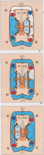 圖2:當受空氣擠壓之膜片A達到其位移極限時,空氣閥會將空氣引導至膜片B之背面,同樣形成擠壓力而使其推離中心體,同時將連結的膜片A拉回中心體,此時膜片B之驅動所產生的液壓將入口閥球推回閥座,同時將出口閥球推離閥座使流體能被擠壓而從出口排出泵體外。膜片A被拉回中心體這個動作使A室形成真空狀態,因而能靠大氣壓力作用將流體由入口支管將閥球推離閥座而進入A室直至填滿。