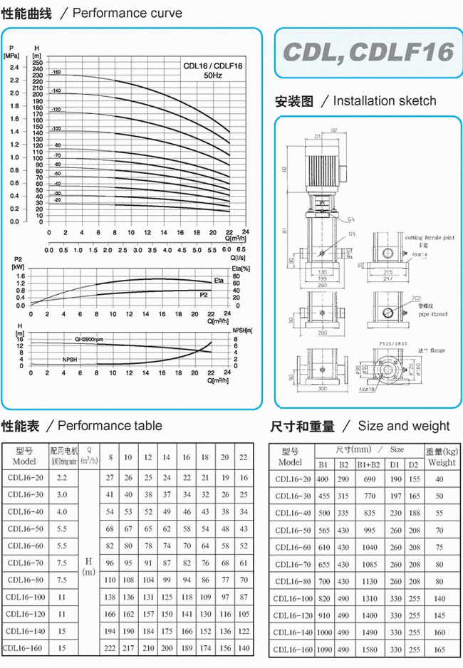 CDLF系列輕型不銹鋼立式多級泵性能參數表(2)