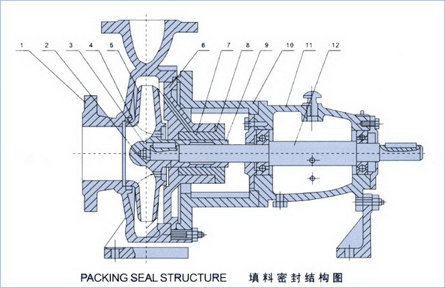 IH型化工泵|結構圖說明IH型化工泵結構圖1、泵體2、葉輪螺母3、止動墊圈4、密封環5、葉輪6、泵蓋7、填料8、填料壓蓋9、軸套10、中間托架11、懸架12、泵軸