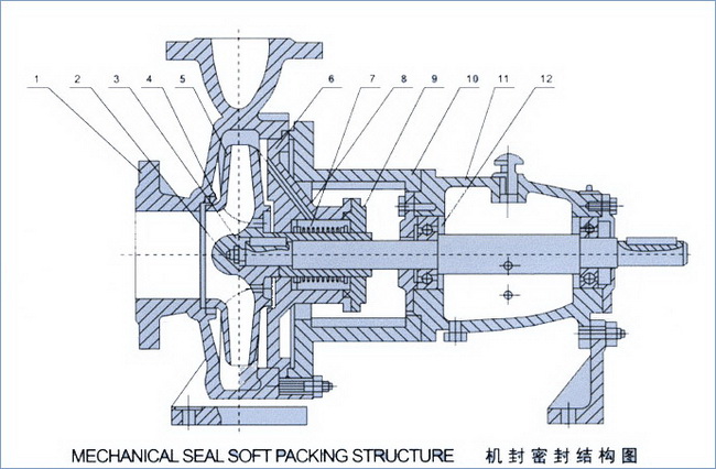 ![]() IH型化工泵結構圖1、泵體2、葉輪螺母3、止動墊圈4、密封環5、葉輪6、泵蓋7、機械密封8、填料壓蓋9、軸套10、中間托架11、懸架12、泵軸