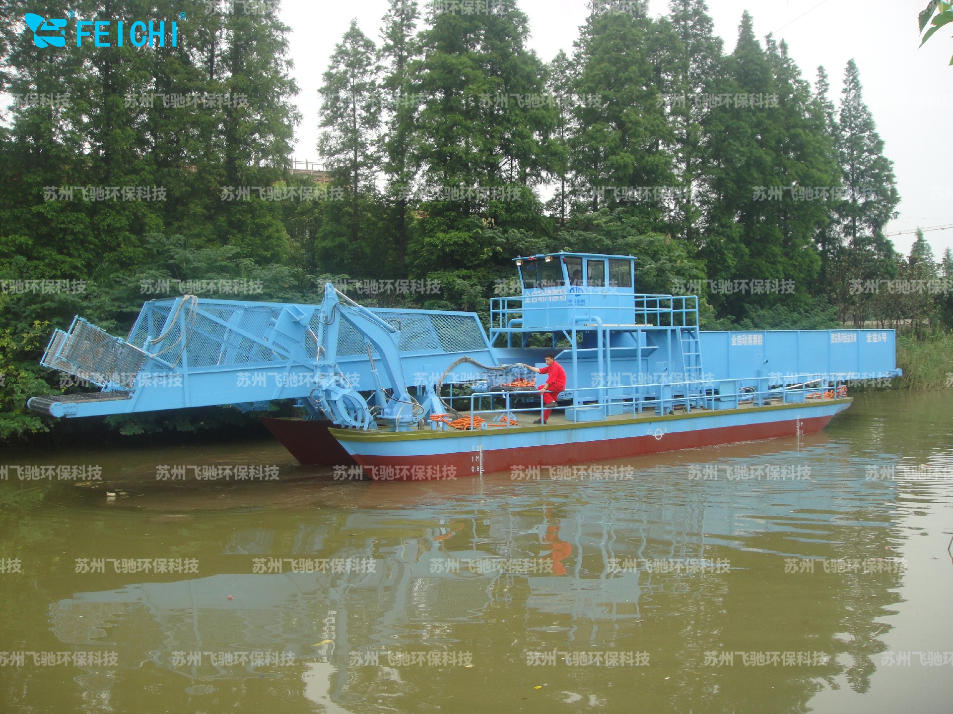+本全自動清漂船的收集卸載方式為前收前卸式,方便地將打撈上來的垃圾自動輸送到裝載船或者靠岸碼頭自卸車箱上。
