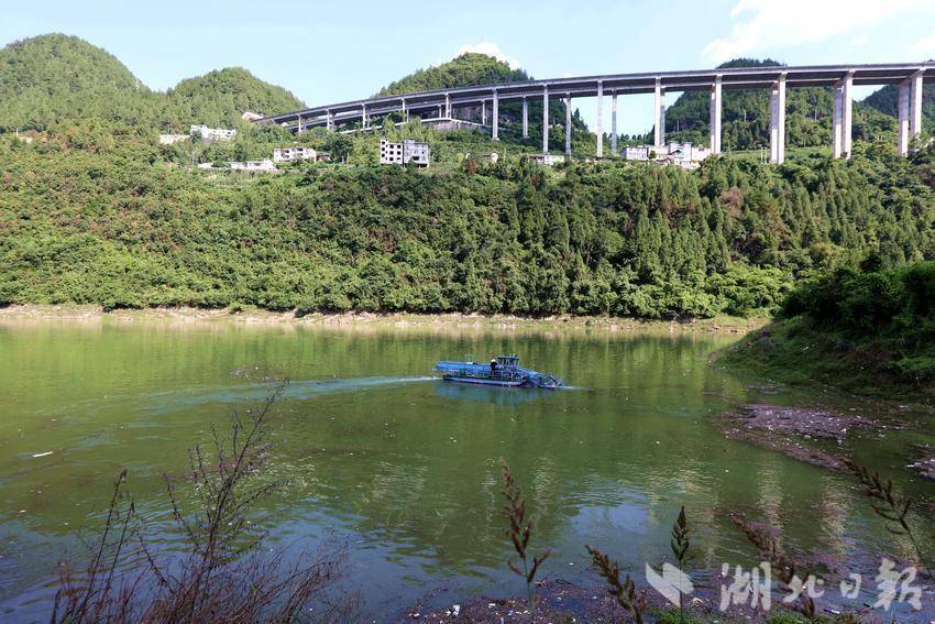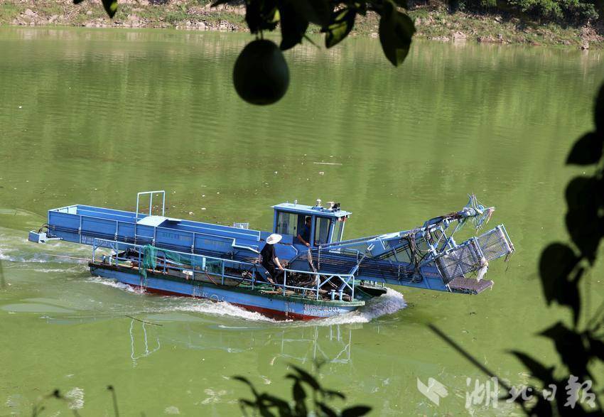 烈日正炎,在咸豐縣朝陽寺鎮朝陽庫區,工作人員熟練操控清漂船,忙碌地打撈河面上滯留的漂浮物。